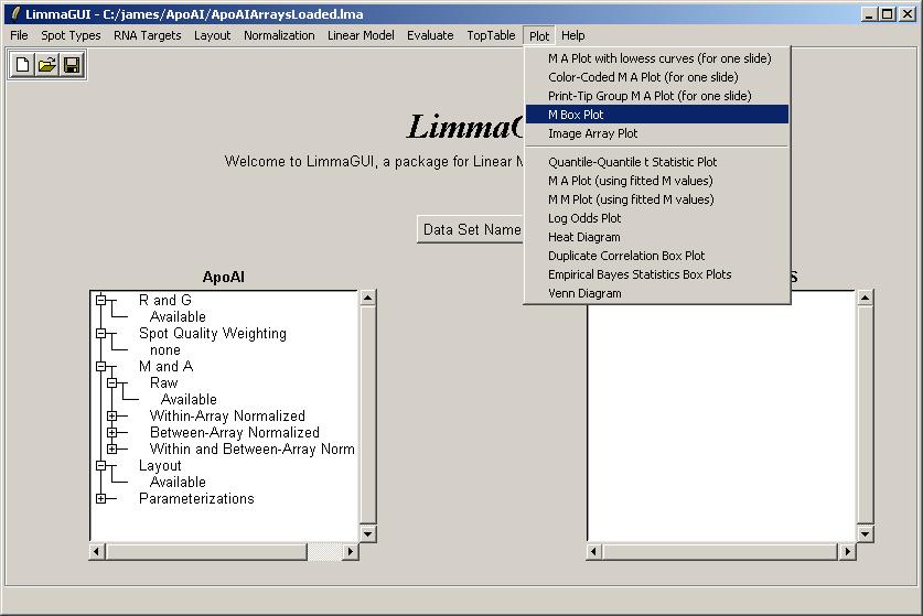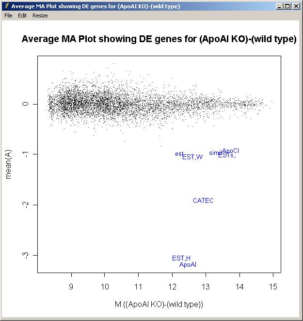 An M A plot with fitted M values can plotted obtained in the same way as the log odds plot, but by choosing "M A Plot(using fitted M values)" from the plot menu, instead of "Log Odds Plot".