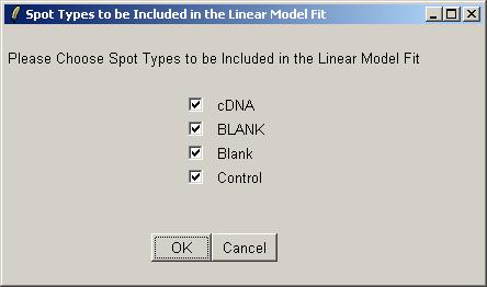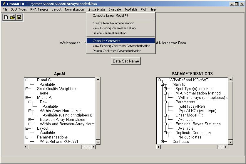 We will now compute a linear model for this set of arrays. As we have three types of RNA (Reference, Wild Type and ApoAI Knockout), we can estimate two parameters from the linear model (i.e. one less than the number of RNA types). The parameterization has already been created and loaded in ApoAI.lma. Click on "Compute Linear Model Fit" from the Linear Model menu.